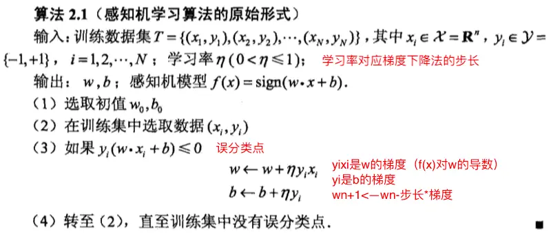 感知机算法是基于随机梯度下降法的对损失函数的最优化算法,有原始形式和对偶形式,算法可以表示如下: