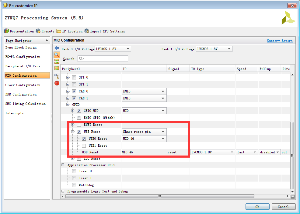 一直以为是设备树的问题,最后发现原来是在Vivado中Zynq系统配置时,没有设置Reset对应的MIO管脚。配置好后就不需要修改pcw.dtsi文件了。如下图,配置了USB的Reset为MIO46。