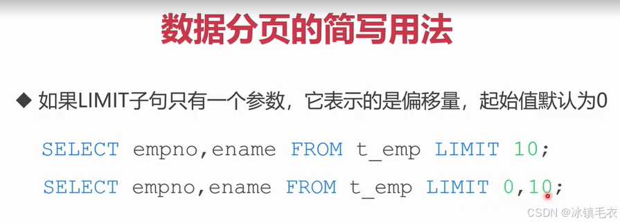 比如说下面这条sql语句,它的limit子句里边只写了一个10,其实它等价于是limit 0逗号时,如果上面这个limit里边写的是20的话,它就等价于是下面这种0到20。