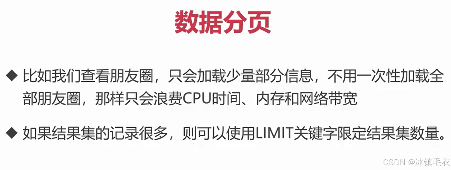 我们打开微信朋友圈,只会加载少量部分的信息,而不是一次性向微信服务器请求全部的朋友圈信息,那样会非常消耗网络流量和服务器的硬件资源,上一节课我们学到了select和from子句,都不能限定结果集的记录数量。于是就需要引入一个新的语法来完成这个功能。那么limit子句就来完成数据的分页。每次我们从结果集里边只获得少量的数据,那么具体方案,咱们来看一下这个limit子句,是写在from子句的后面的limit子句的第一个参数是数据的起始位置。