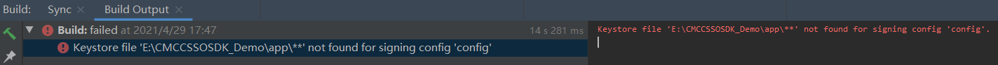 由于SDK提供方在发布demo工程时将app下的build.gradle文件中的signingConfigs中的内容以**替换了,所以开发者直接运行会出现 Keystore file 'XXX:\CMCCSSOSDK_Demo\app\**' not found for signing config 'config'. 目前发现很多开发者面对这个提示一筹莫展完全没有解决思路,更有甚者可能耗时一个下午。