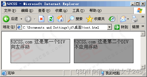 <!DOCTYPE html PUBLIC "-//W3C//DTD XHTML1.0 Transitional//EN""http://www.w3.org/TR/xhtml1/DTD/xhtml1-transitional.dtd"> <htmlxmlns="http://www.w3.org/1999/xhtml"> <head> <metahttp-equiv="Content-Type" content="text/html; charset=gb2312" /><title>52CSS</title> <style type="text/css">#content_a {width:200px; height:80px; float:left; border:1px solid#000; margin:10px; background:#ccc;} #content_b {width:200px;height:80px; border:1px solid #000; margin:10px; background:#999;}</style> </head> <body> <divid="content_a">52CSS.com 这是第一个DIV 向左浮动</div> <divid="content_b">52CSS.com 这是第二个DIV 不应用浮动</div> </body></html>