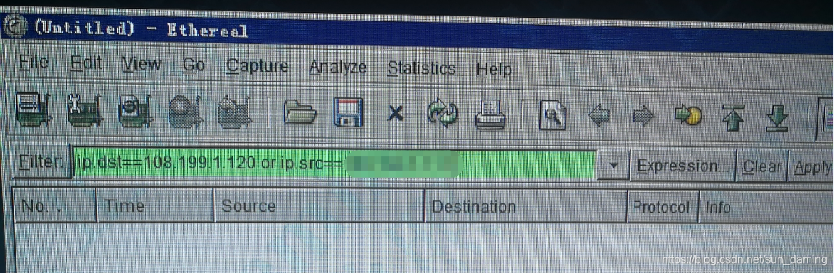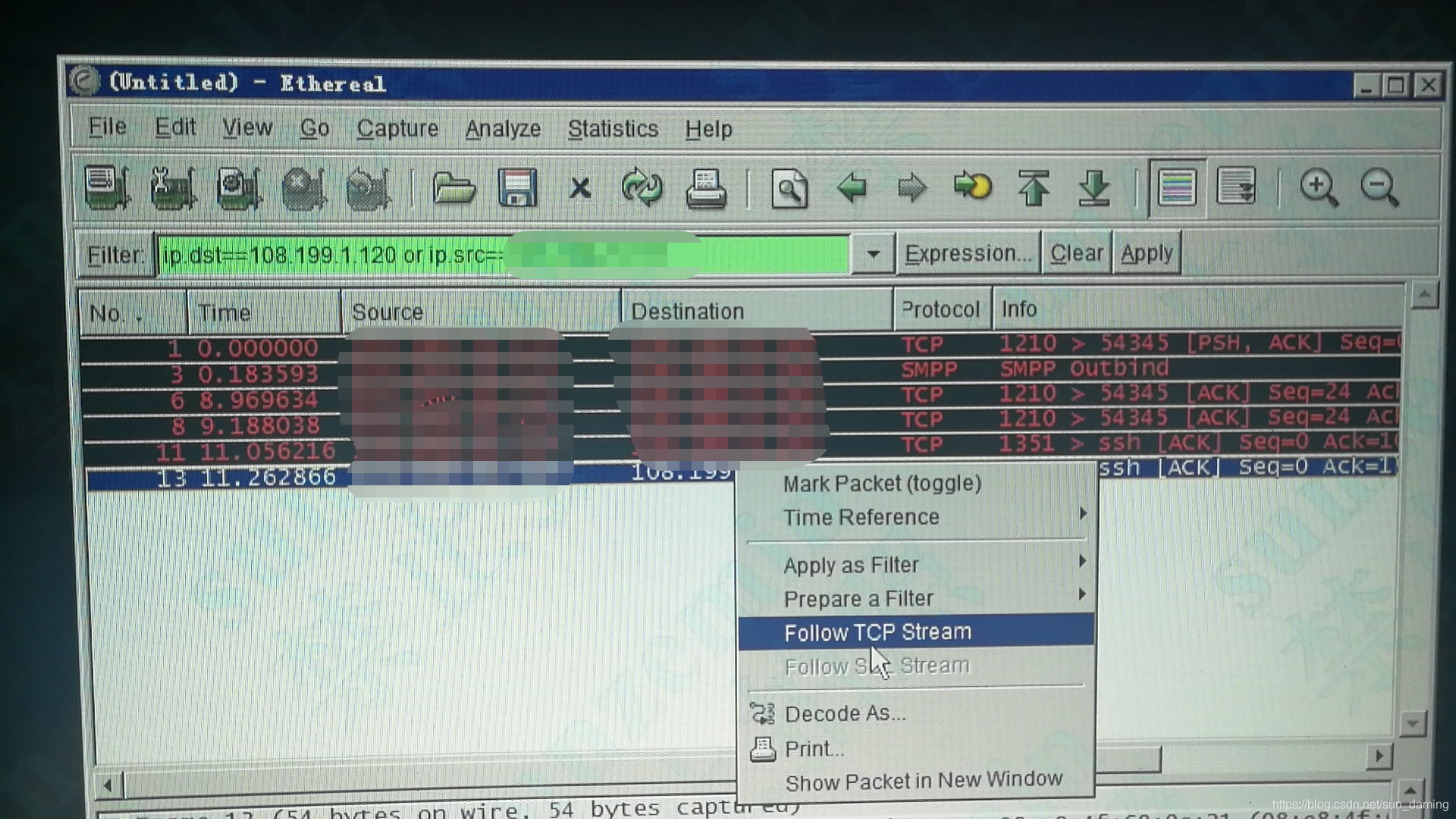 - 这时就开始打开url开始需要操作的动作,Ethereal就开始抓包了,结束后点击抓包工具最下面的STOP,,这时工具中就会出现相当多的抓包信息,筛选下:我一般根据ip地址来做,ip.dst==108.199.1.120(注:这是本地ip) or ip.src==108.199.21.21(这里是远程的ip地址),如下图: