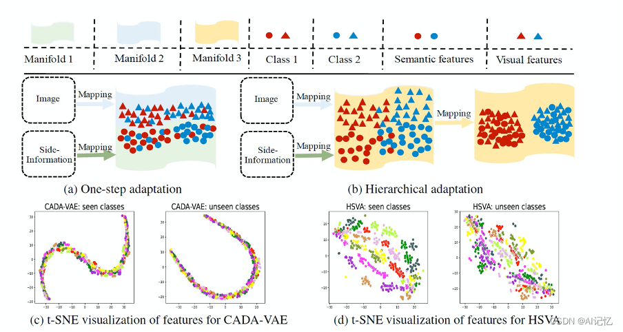 ZSL核心需要解决的是如何把已见类的语义知识迁移到未见类上。目前的方法更倾向于设计一个可以拉近语义和视觉分布的commonspace, 如下图的(a)。 但是由于视觉和语义信息是异构的,这就使得这两种信息之间的差异还应该包含结构上的不同,如下图(a),传统的ZSL之拉近视觉和语义信息之间的分布,会导致语义信息和视觉信息还是保留本身的流形结构。进一步,通过(c)和(d)的可视化也可以看到如果不加上流形结构上的对齐,不同类之间的边界不是很明显。