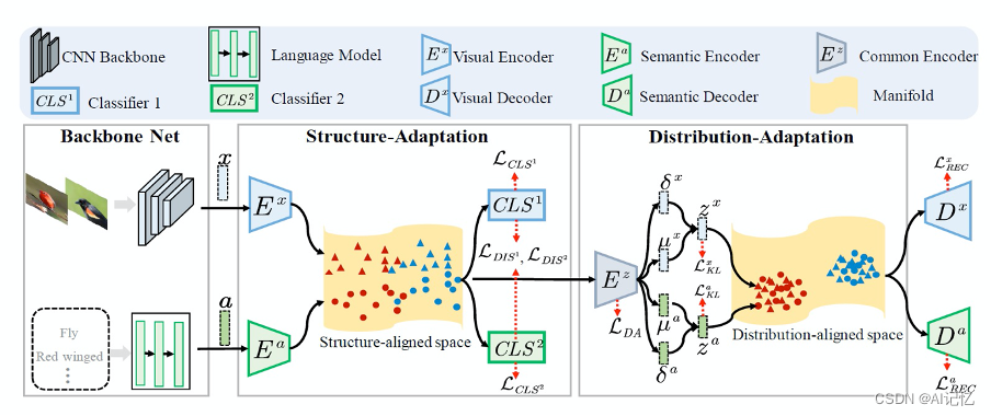 基于上述的分析,我们在传统的one-stepzsl算法中(上图中的backbone net + distribution-adptation module)引入了structure-adaptionmodule来拉近视觉和语义信息之间的结构差异。