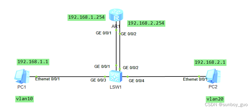 PC1属于vlan10,网关是R1的g0/0/1接口, PC2属于vlan20,网关是R1的g0/0/2接口。PC1访问PC2,通过R1进行三层的寻址和转发。交换机SW1的G0/0/3接口属于access接口,默认vlan10,G0/0/4接口属于access接口,默认vlan20,G0/0/1接口属于access接口,默认vlan10,G0/0/2接口属于access接口,默认vlan20。