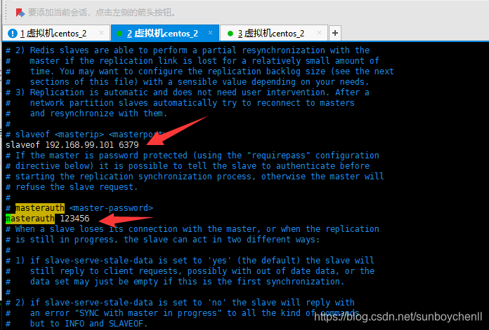 slaveof 192.168.99.101 6379 # 永久为从,指定主服务器ip和端口,最后一行添加192.168.99.101 6379是主IP和端口