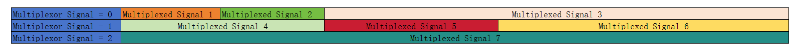 Multiplexor Signal在CAN报文中占有部分字节的位置,其他位置分配给Multiplexed Signal使用,可以根据通信需求来进行信号的布局,举例如下: