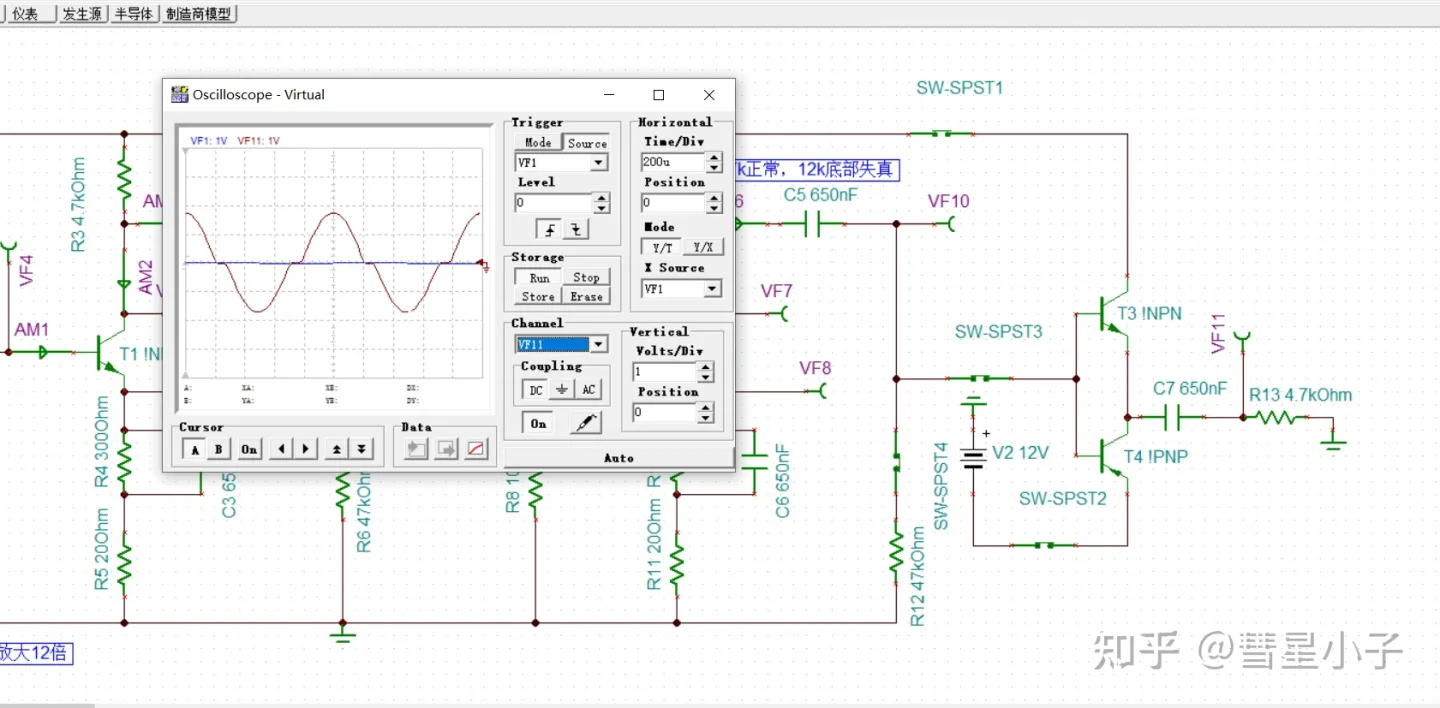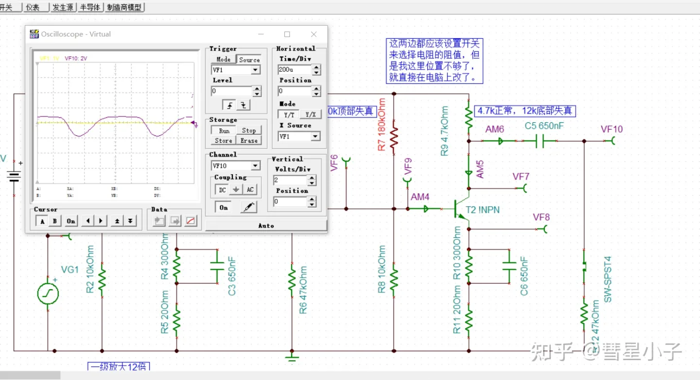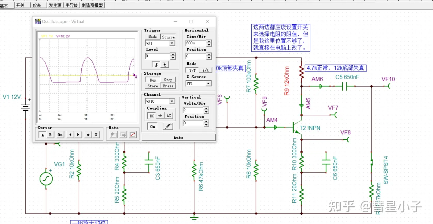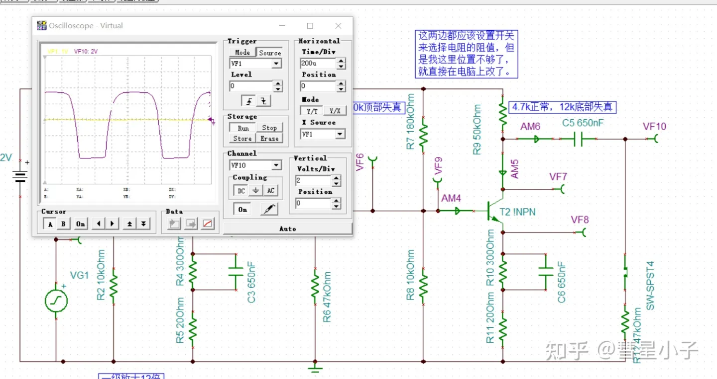 其他电阻阻值不变,改变R9的阻值,你就可以得到底部失真的图像,当然还是选择好看的那个。