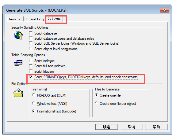 4、切换到"选项"选项卡,钩选"编写主键、外键、默认值和检查约束脚本