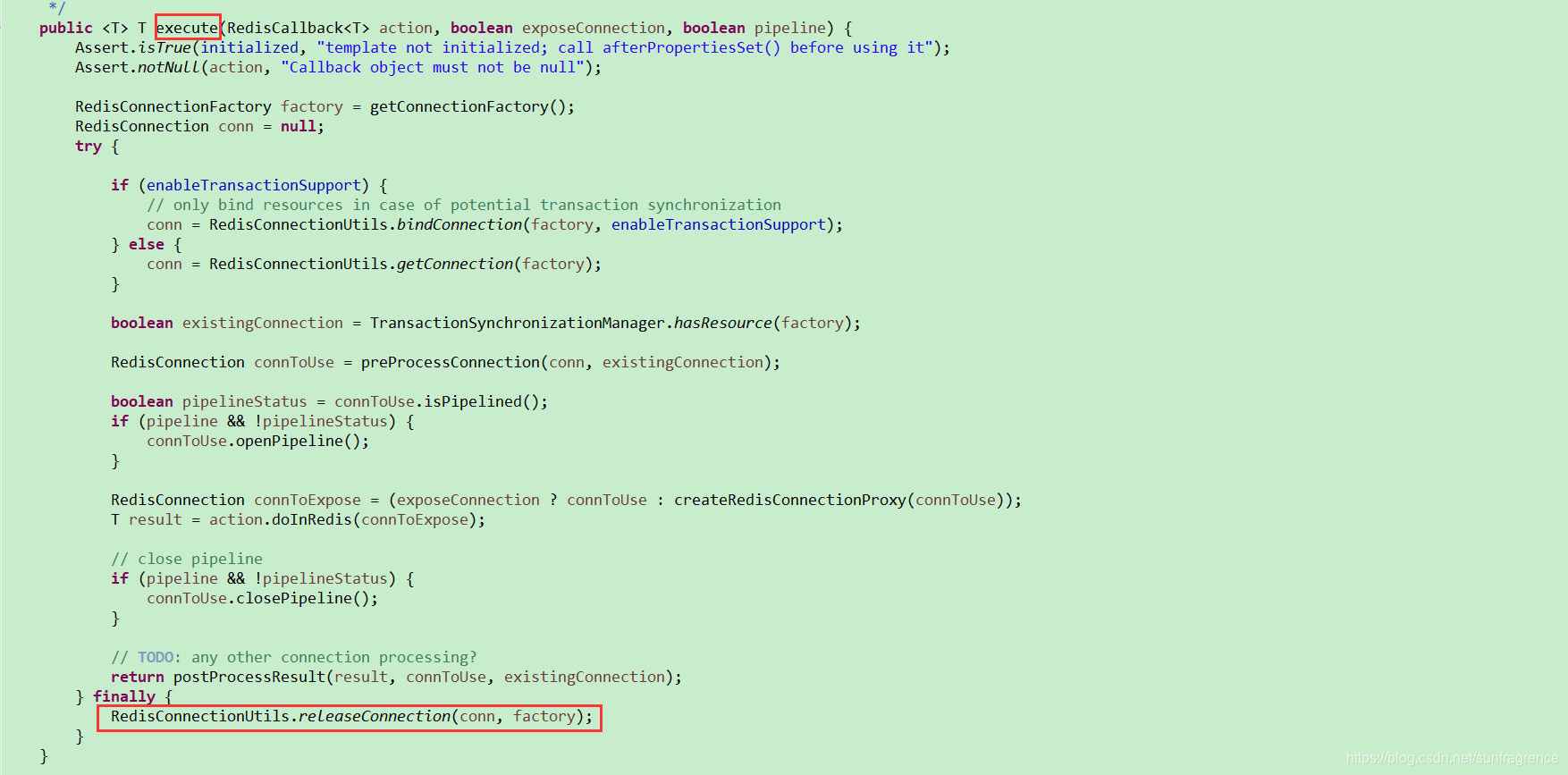 RedisTemplate封装的redis操作方法,大多方法最底层都会调用最核心的excute方法,在excute方法的finally模块可以看到每次操作完成后都会自动关闭释放连接。该原因剔除!