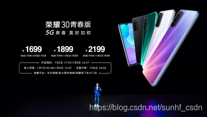 荣耀30青春版共有3个版本,6GB RAM+64GB ROM版本售价1699元,6GB RAM+128GB ROM版本售价1899元,8GB RAM+128GB ROM版本售价2199元;夏日彩虹、幻镜银、绿野仙踪、幻夜黑四种配色。7月8日10:08分将在华为商城、京东、天猫、苏宁易购、唯品会、国美、荣耀亲选等线上线下渠道同步首发开售。