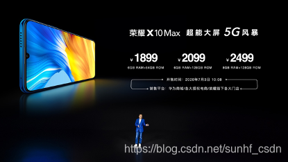 荣耀X10 Max首发价格为6GB+64GB版本1899元,6GB+128GB版本2099元,8GB+128GB版本2499元,并有竞速蓝、探速黑、光速银三种配色。同时,荣耀X10全新配色燃力橙7月2日正式开售。荣耀X10 Max将于7月3日在华为商城、各大授权电商平台、荣耀线下各大门店正式开售。
