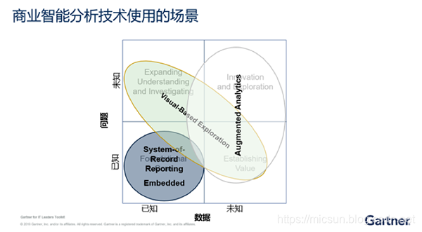 目前,传统的大型数据分析厂商均有自己的旗舰型产品,例如Cognos、SSAS/SSRS。Microsoft Power Bi和Tableau是现在市场上现代化商业智能的主导者,以可视化的形式进行数据分析。Gartner认为,在未来的两到五年内,市场上将有很多企业开始涉足增强型分析领域,让用户以更低的门槛去做更高阶的数据分析。
