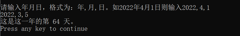 printf("\n请输入年月日,格式为:年,月,日。如2022年4月1日则输入2022,4,1\n");