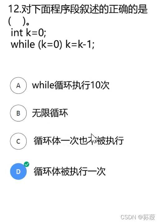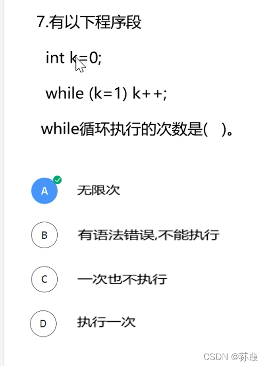 while后的表达式是赋值表达式k=1每次判断时k的值都被赋值为1,1不等于0为真,所以是死循环。
