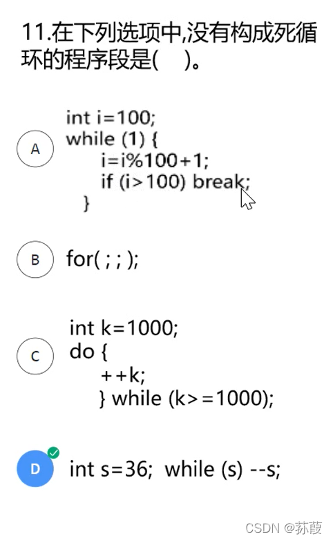 A.i=i%100+1最大为100,不满足i>100,不能执行break语句,无法跳出进入死循环