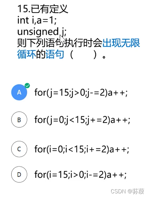 int不特别声明,默认是有符号的;unsigned j是无符号整型变量j,int省写;j没有负数的概念 ,A会进行无限循环