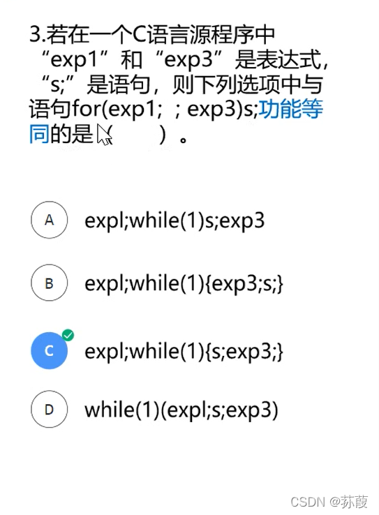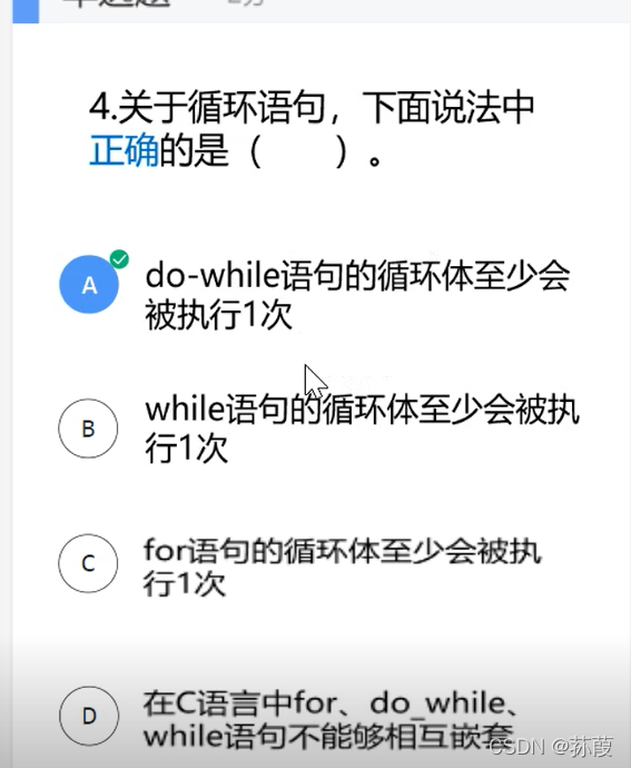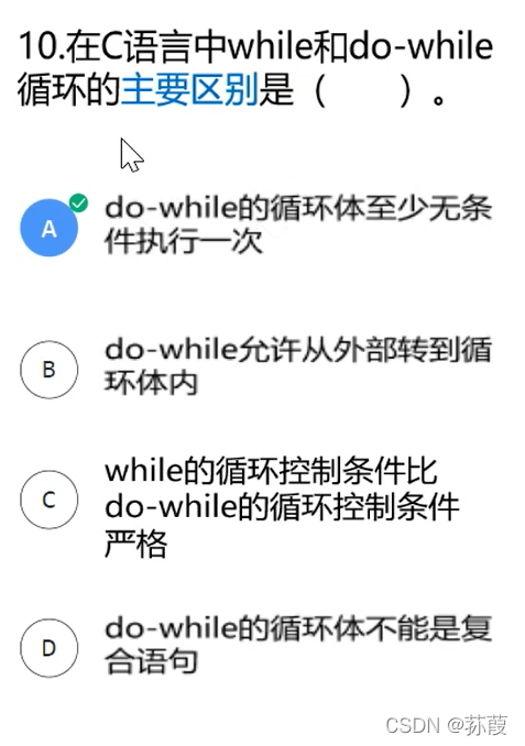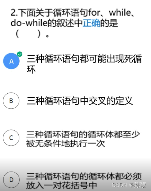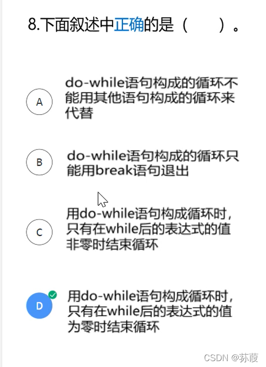 C、①while后表达式为0的时候结束循环②循环体中遇到break结束循环