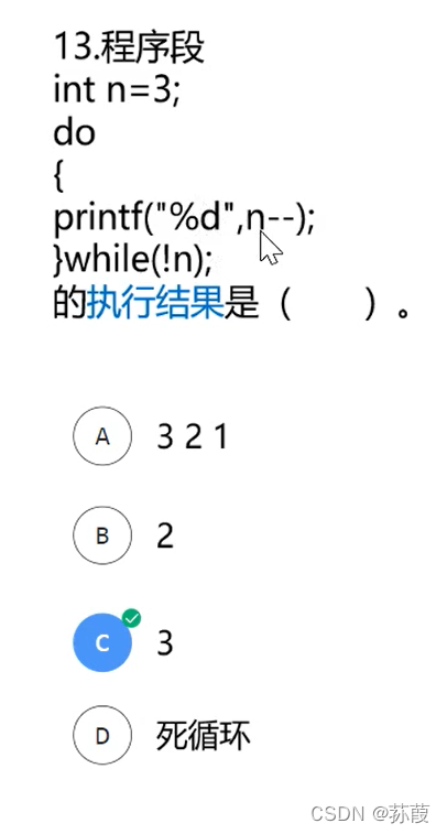 自减运算后置,先将n没有减1之前的值输出为3,再将n的值减1变为2,!2为假,循环只执行一次。