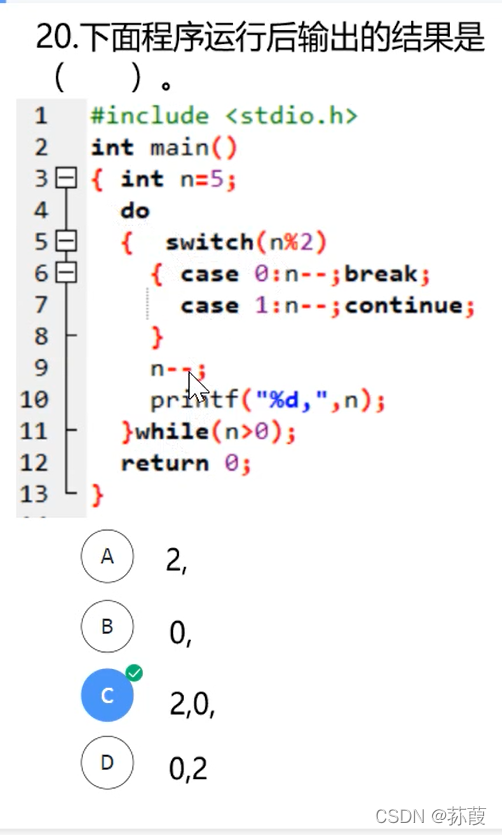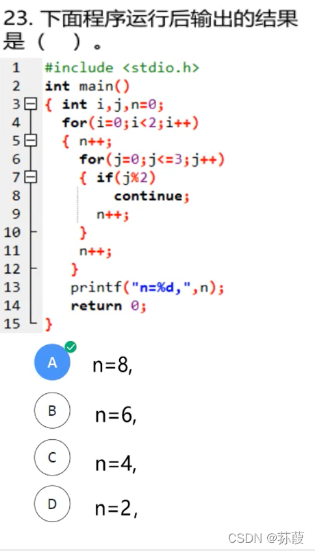 j=0,j%2=0,执行n++;当j%2≠0,执行continue,不执行n++