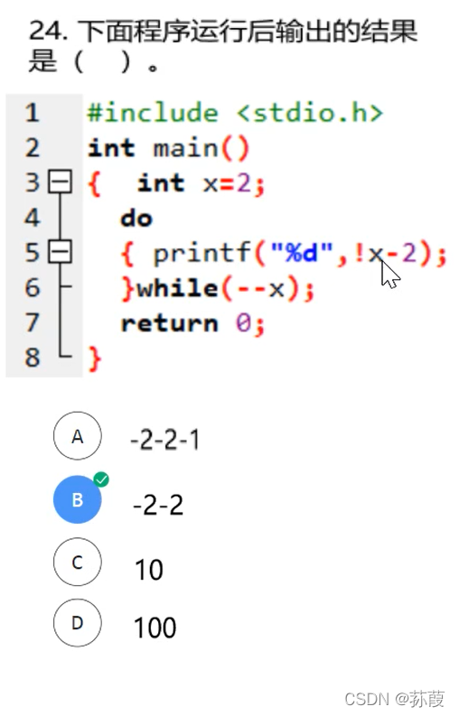 !(逻辑非)单目运算优先级比减法运算符高,x=2逻辑值为真,!x逻辑值为假,提供的值为0