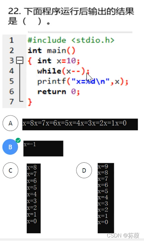 后置自减,x=0作为while后面判断的条件不再执行循环体,while结束的时刻x再减1变为-1