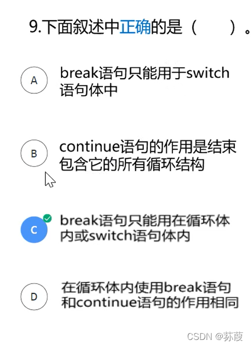 C.break语句只能用于循环语句和switch语句之中,而不能单独使用。continue只能出现在循环语句中。