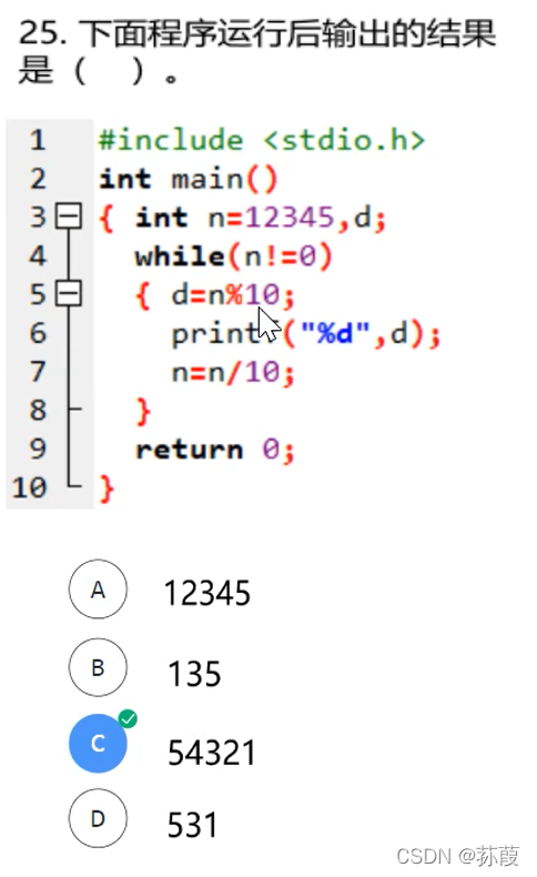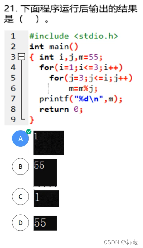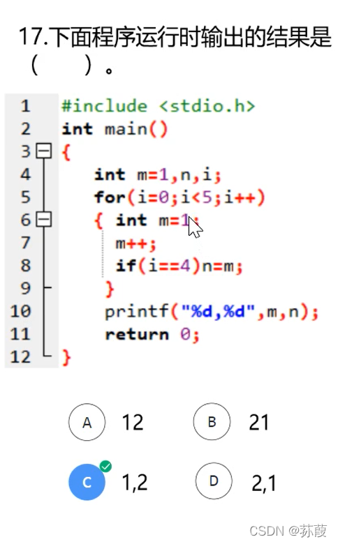 (超范围了,涉及局部变量和全局变量)for循环内定义了同名的变量m,在复合语句(花括号)内起作用,第四行m在6-9行不起作用,同名遮挡。两个m的存储空间不同,第10行的m指的是初始的第四行的m,始终没有改变。