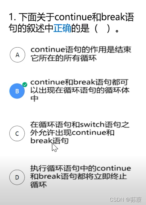 D.执行break语句将立即终止最内层循环,而执行continue只结束一次它所在的最内层循环,而不是立即终止循环。