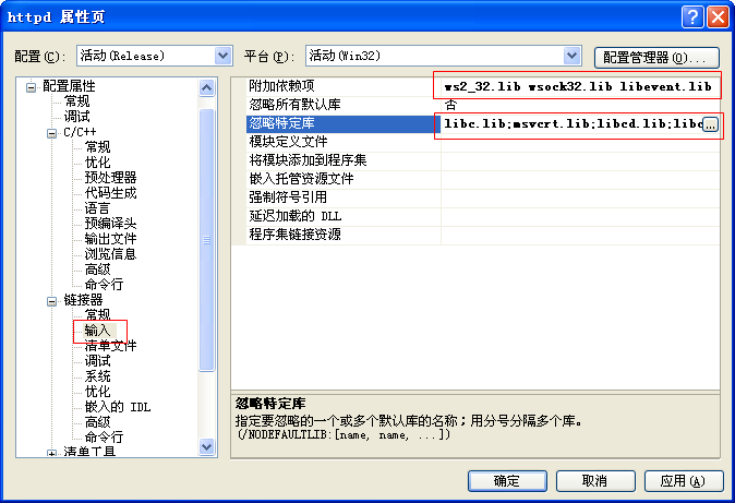 9、回到 Visual Studio 2005,在左侧菜单中【解决方案“httpd”】下面一行【httpd】上点击鼠标邮件,选择【属性】,对每项内容进行修改。下图中红框内的数据即为修改后的数据。