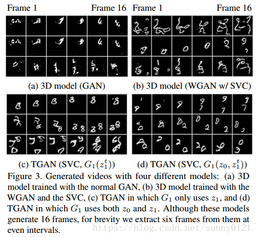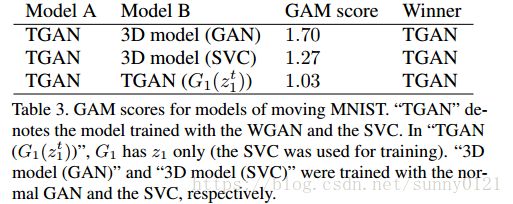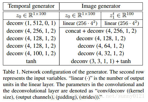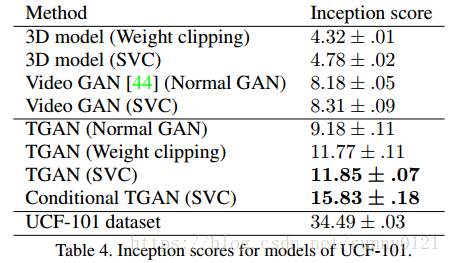 作为输入,输出视频。为了解决原始GAN训练不稳定的问题,引入了WGAN,又因为TGAN对WGAN中的参数比较敏感,作者将WGAN中的权值分割方法用SVC方法代替,从而使得模型更加的稳定,并且在损失函数不同于传统时仍然能够成功的训练。网络结构如下: