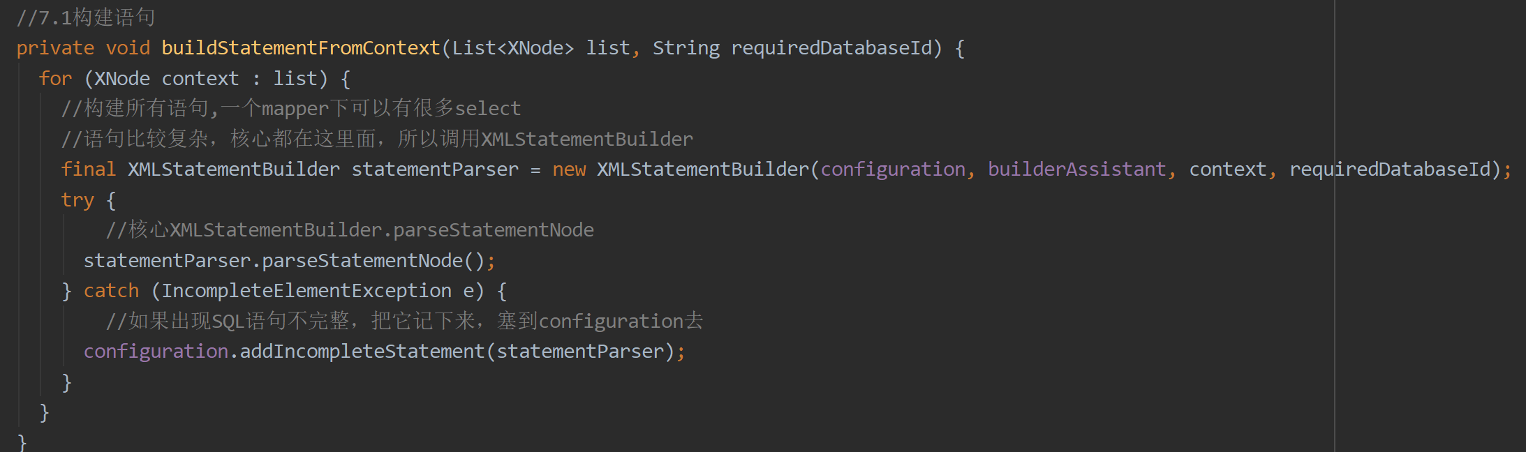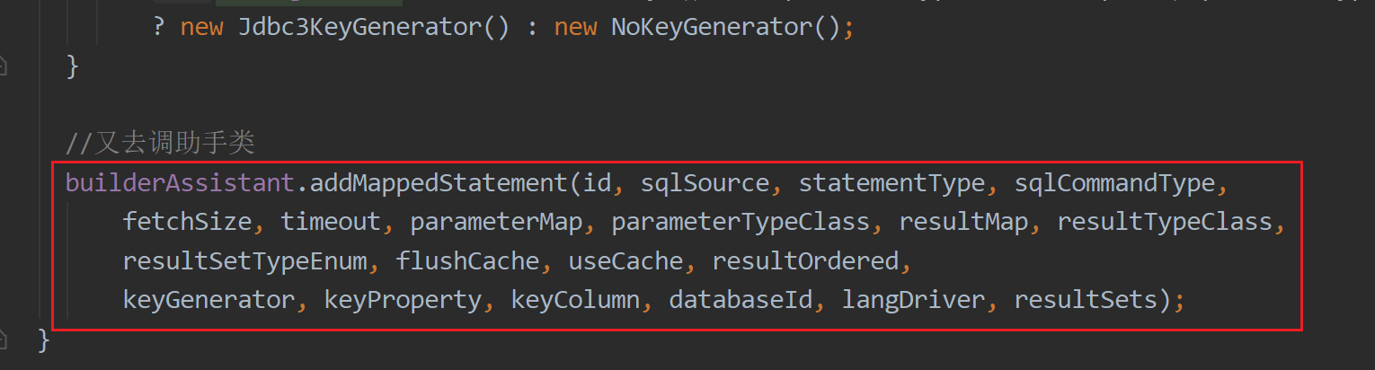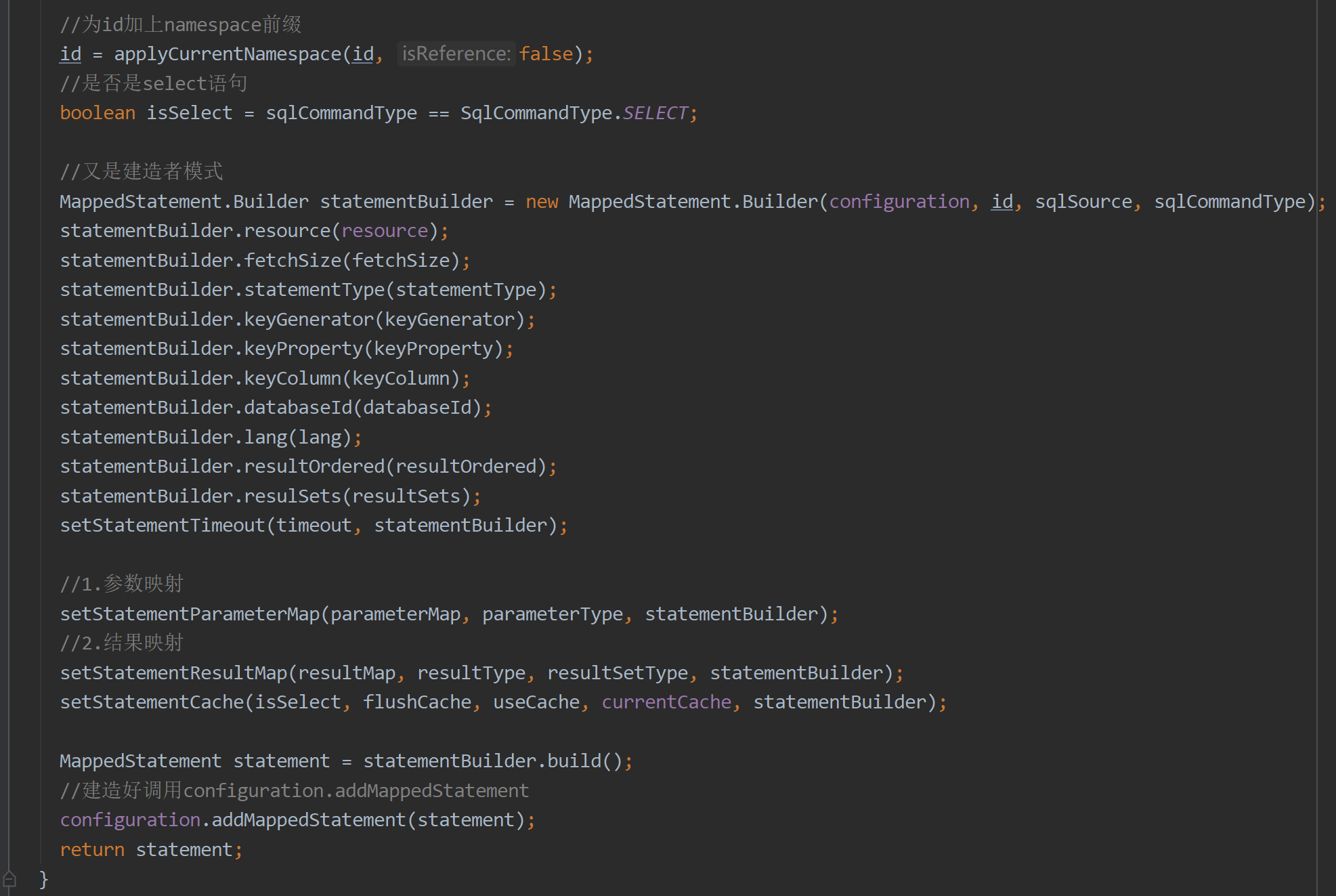经过一系列跳转后它进入了buildStatementFromContext方法中,这里通过一个XMLStatementBuilder对象来进行构建,在statementParser.parseStatementNode()方法中,解析完所有的属性后,在方法的最后它调用了一个助手类,将所有的配置都通过它来加载,在这个助手类的方法中,他通过建造者模式来构建MappedStatement对象,并放在configuration中。