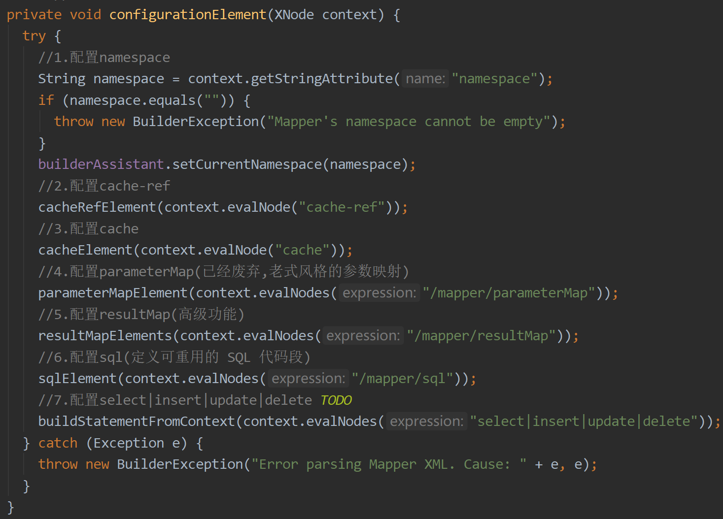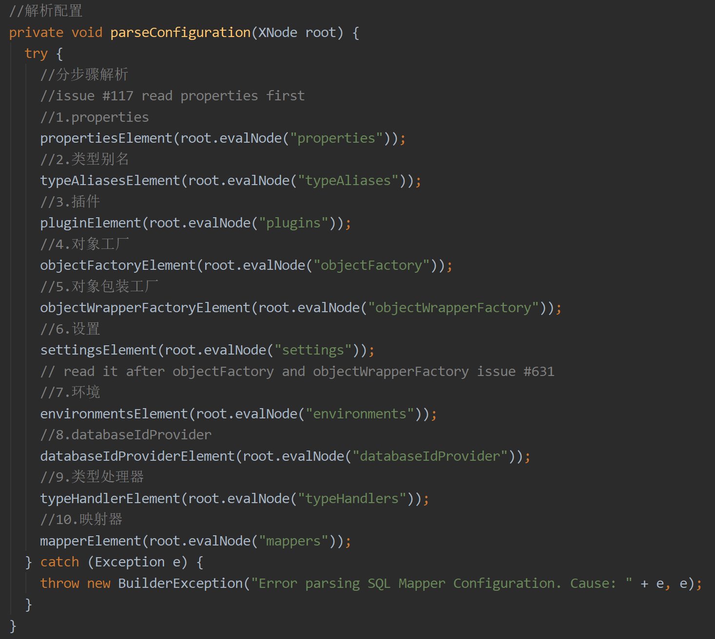 在parse方法中,仅一个判断是否解析过的逻辑便进入parseConfiguration方法中,这里才是真正的解析方法。可以看到这里面依次对配置文件中的各种标签都分开进行解析,我们重点关注数据源和映射文件的解析过程。