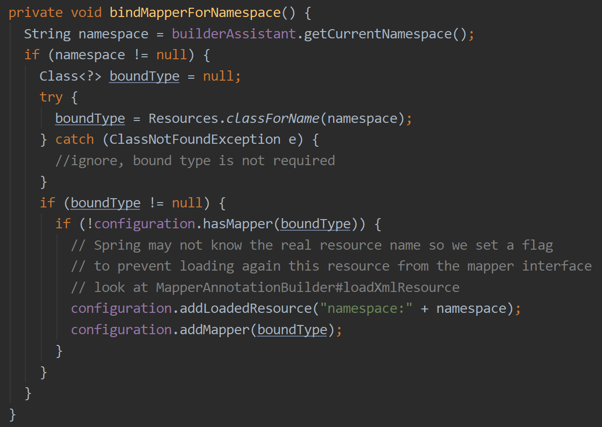 在mapper的解析过程中突然多了一个MapperBuilderAssistant助手类,这个类有什么作用呢?从源码来看,配置的加载过程就是一个Builder对象传递到另一个Builder分步进行解析,最后都汇总到configuration中的过程。这些Builder类都有一个父类,抽象类BaseBuilder,他规定了一些基础的解析方法,其他所有的Builder都继承他并加以扩充改造,MapperBuilderAssistant同样也继承了BaseBuilder父类,他和XMLMapperBuilder对象相互合作,XMLMapperBuilder负责解析XML文件,MapperBuilderAssistant负责处理解析出的数据,帮助XMLMapperBuilder将解析出的sql、namespace数据封装后存储到configuration当中。