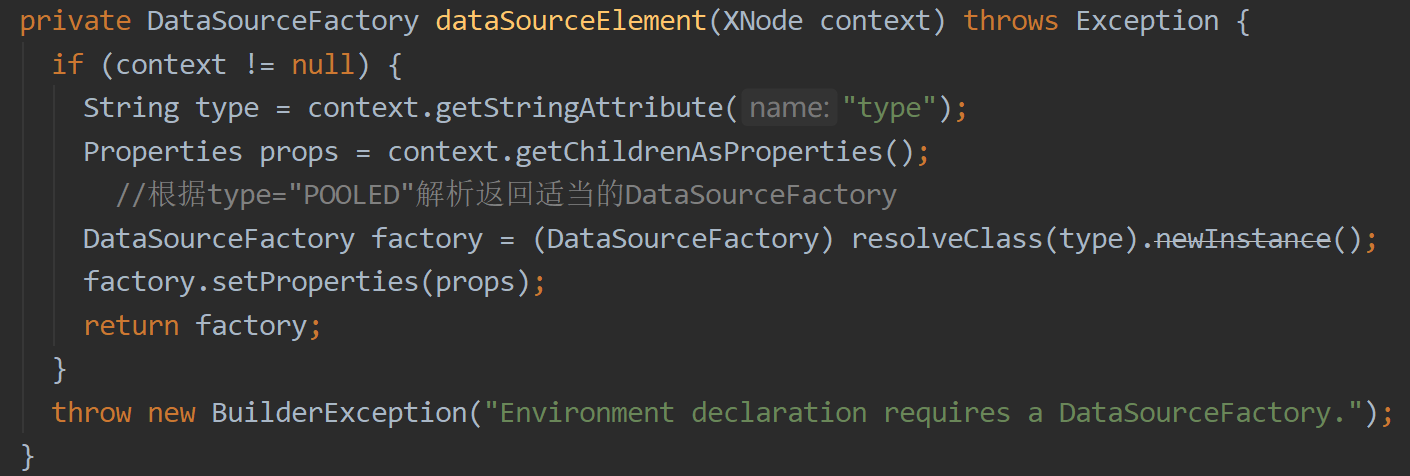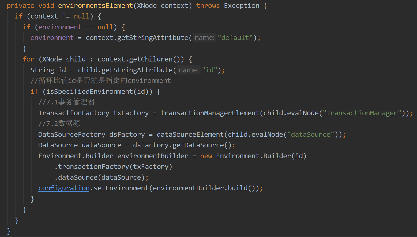 数据源的解析主要在environmentsElement()方法中,进入这个方法可以看到主要分为两步,对事务管理器的解析和数据源的解析