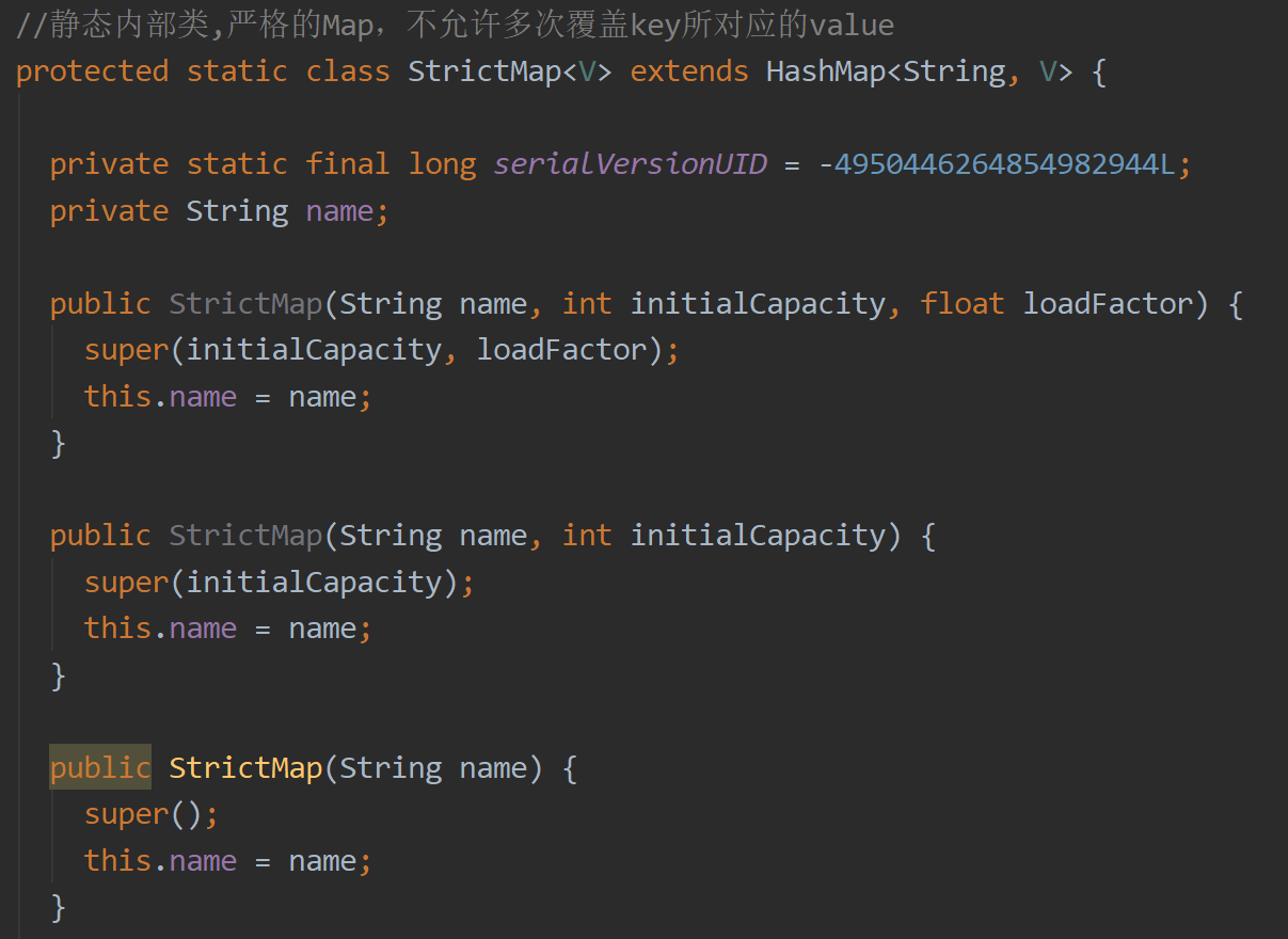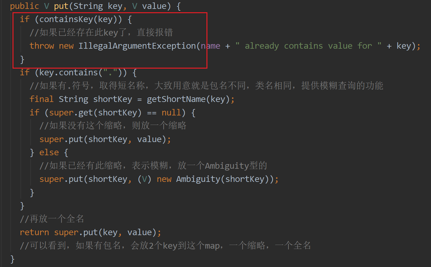 可以看到相较于HashMap,StrictMap在放入元素前会先判断下是否已经存在这个key,如果有直接报错,表示StrictMap不允许对key进行覆盖和替换