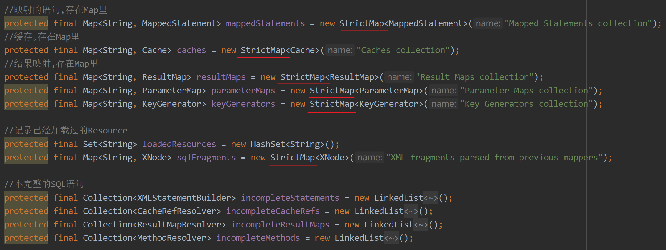 下面这些是关于sql语句以及数据源的配置,可以看到这些都是通过map表来存储的,红线出可以看到用的并不是Java自带的Map,StrictMap是MyBatis对HashMap继承后的静态内部类,相较于HashMap来说它更严格,不允许多次覆盖key所对应的value.