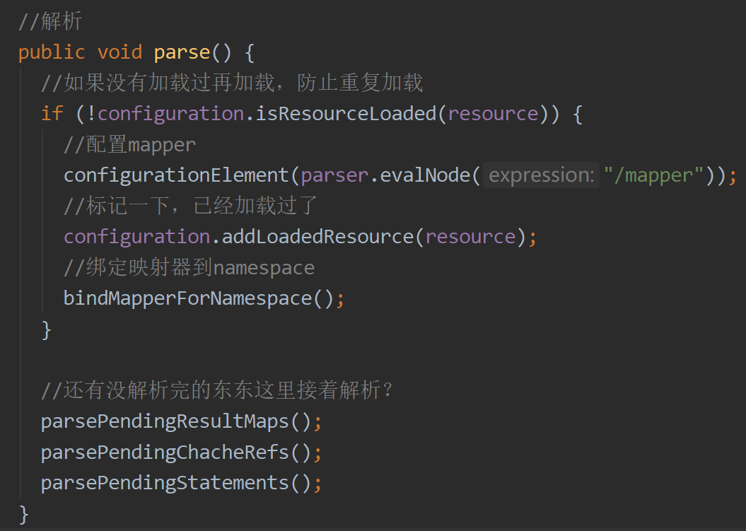 XMLMapperBuilder专门负责mapper映射文件的解析,构建XMLMapperBuilder后调用parse()方法来进行解析,在这个方法中除了解析外,和XMLConfigBuilder相比,还多了一个绑定映射器到namespace的过程,这两步可以分开说