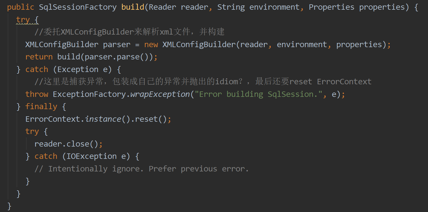 MyBatis加载需要通过SqlSessionFactoryBuilder对象构建出一个SqlSessionFactory对象,这个对象应该是单例的,全局可用。MyBatis配置的加载就从这个build方法开始。