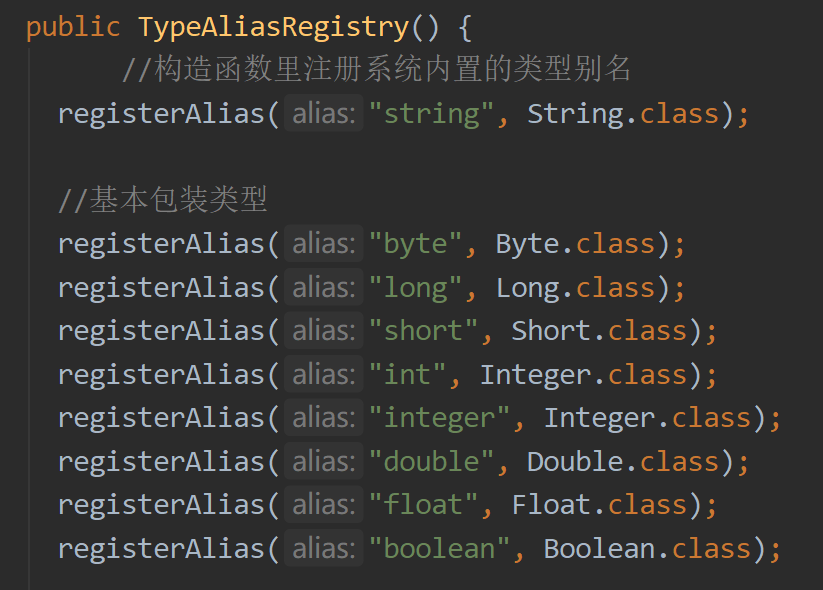 typeAliasRegistry别名注册器,这个对象的构造方法中包含MyBatis中内置的别名以及这些别名的类对象,十分重要。下图贴出的是别名注册器无参构造方法中的一些别名。