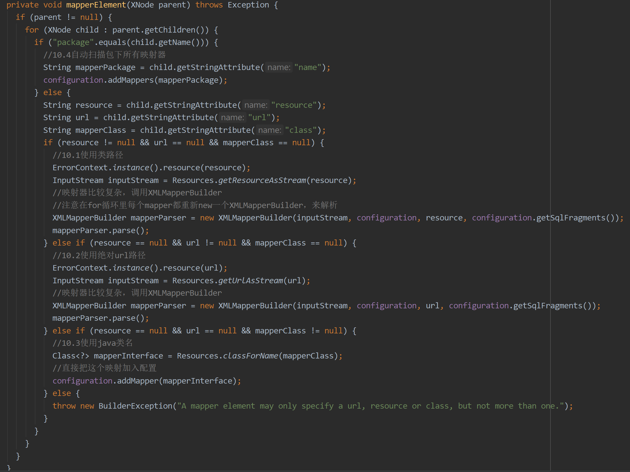 映射文件的解析主要在mapperElement()方法中,同样的,由于它下面可能有多个mapper标签,因此先通过for循环来循环解析,然后加载resource属性,获取流对象后通过XMLMapperBuilder对象来解析mapper文件。
