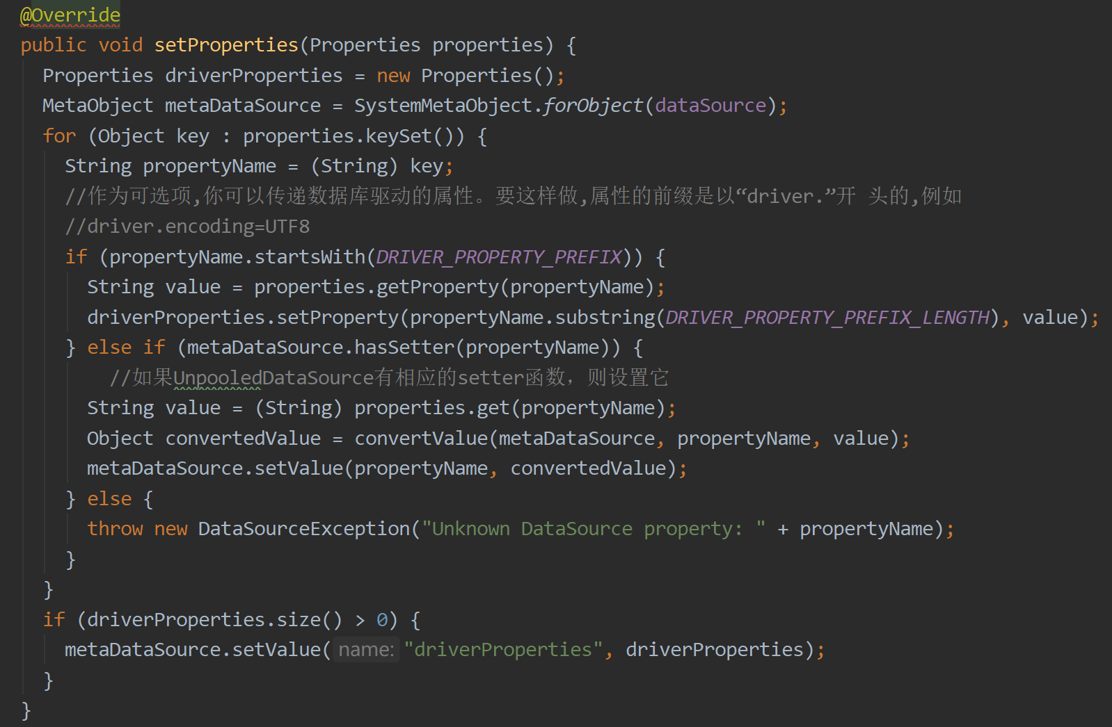 数据源的解析与事务管理器大同小异,不过数据源由于有多个属性,就通过getChildrenAsProperties()方法来解析name和value生成properties对象,最后通过数据源工厂对象的setProperties()方法来加载驱动