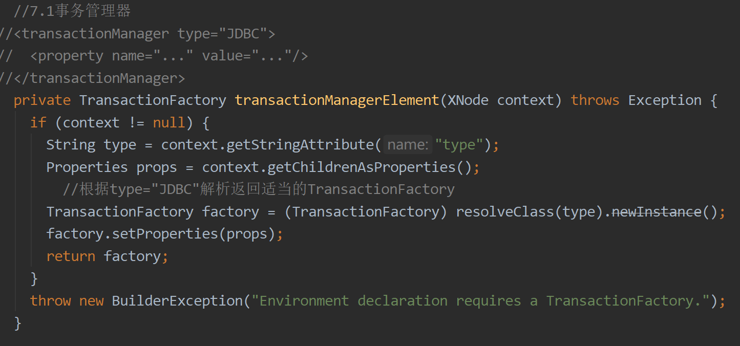 事务管理器分为JDBC和cjlib两种,通过解析type属性获取,然后再通过resolveClass来构建事务工厂。