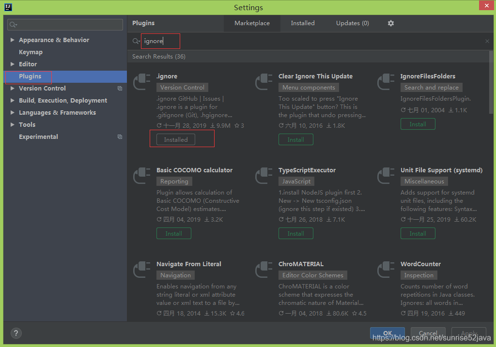 File->Settings ,在左侧菜单找到Plugins,输入搜索ignore,点击“install”(下图是安装好后的截图,已经是installed),安装结束后,重启IDEA。