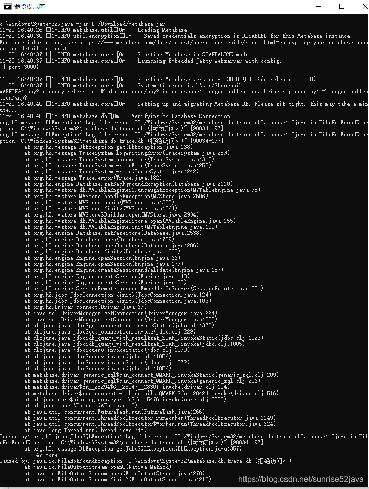 找不到文件java.io.FileNotFoundException: C:\Windows\System32\metabase.db.trace.db (拒绝访问。)