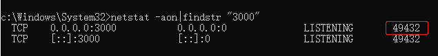 (2)查看被占用端口对应的PID,输入命令:netstat -aon|findstr "3000",回车,记下最后一位数字,即PID,这里是49432。