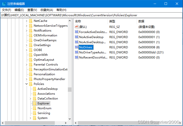 找到名为NoDrives的DWORD(32位)值,双击该值,将其数值数据改为0x8。
