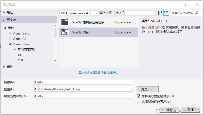 1、在HelloApp文件夹内新建【Win32项目】,名称为Hello。