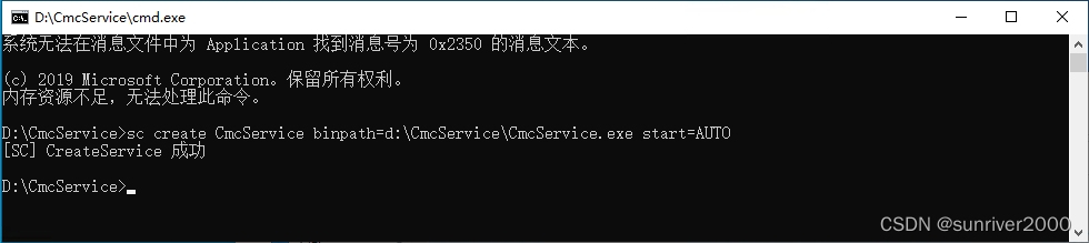 sc create CmcService.exe binpath=d:\CmcService.exe start=AUTO